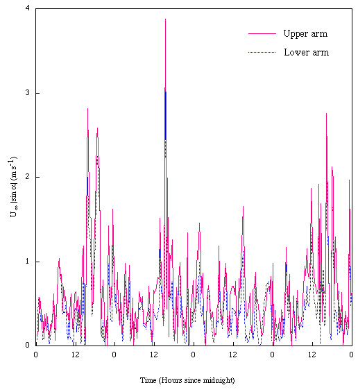 Figure 6. Sine-weighted wind speed measurements during the time interval of Figure 1. The sine function weighs in favor of heat transfer traversing the floodplain (as in Fig. 4) over heat transfer along the corridor.